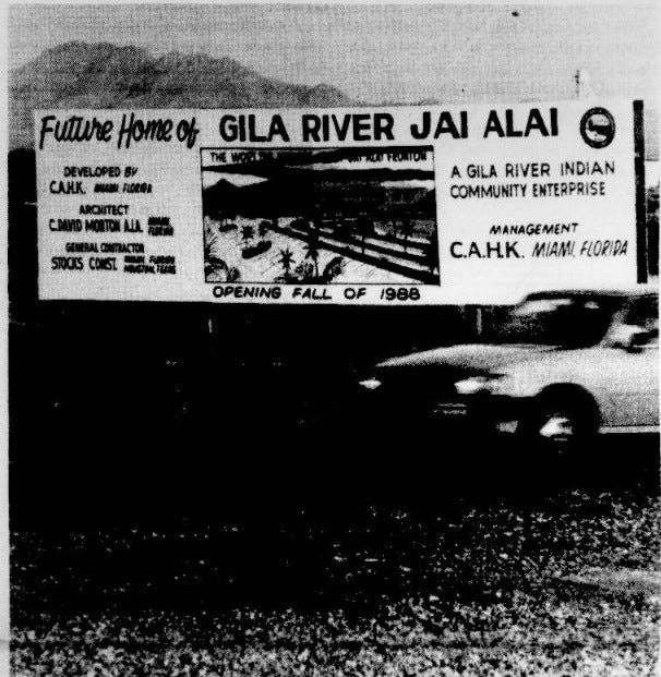 This saga began in early 1985 when a company called C.A.H.K. Enterprises approached the tribe with the idea of developing jai alai and pari-mutuel wagering on Gila River land.